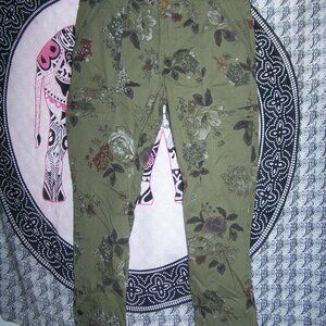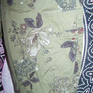 Green with muted floral pattern all over. Button and zip closure. Belt loops, 2 front pockets, cargo pockets on each side, 2 back pockets, and adjustable snaps for varying lengths at the hem.