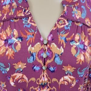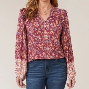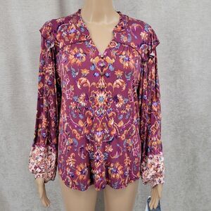 Democracy Floral Blouson Long Sleeve Ruffle Shoulder Vneck Top NEW
