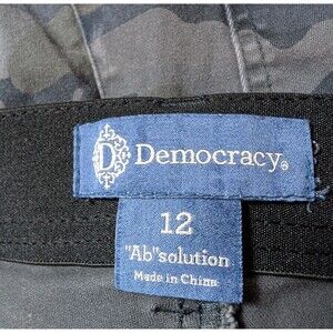 These Democracy Jeans in size 12 feature a stylish green camouflage pattern in stretch denim fabric. The skinny fit jeans have a 9.5-inch rise with a 28-inch inseam and a 5-pocket design, including accents like zippers. The Ab Solution model includes slimming and shaping features, making it easy to care for and comfortable to wear. Perfect for all seasons, these trendy jeans by Democracy are ideal for women seeking a flattering and fashionable look with a touch of edgy style.