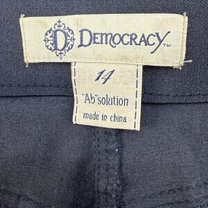 Democracy Women's Denim Jeans. Black in color. Dark denim wash. Tagged size 14. These women's Democracy jeans feature a five pocket design, a straight tapered leg, the "ab-solution" and a high rise fit. Style number B05VXSL. In preowned condition with minimal signs of wear.