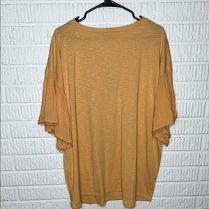 Stylish mustard top with lace-up front. Features crochet sleeve accents. Ideal for casual wear.