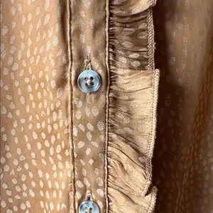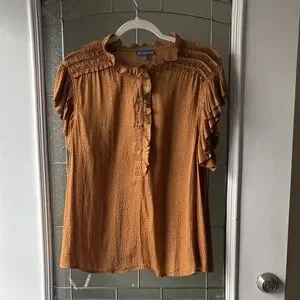 Chic rust blouse with ruffled details. Button-up front. Perfect for versatile styling.
