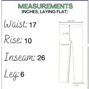 Waist: 17" -Rise:10" -Inseam: 26" - Leg Opening: 6"