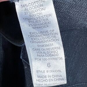 These Democracy Skinny Ankle Skimmer Jeans in dark blue offer a flattering fit with built-in slimming panels and signature booty lift design. Crafted with stretch denim for comfort and shape retention, they feature six functional pockets, a zip fly with button closure, belt loops, and dark tonal stitching. Size 6. Excellent used condition. 54% cotton, 27% rayon, 17% polyester, 2% spandex.
