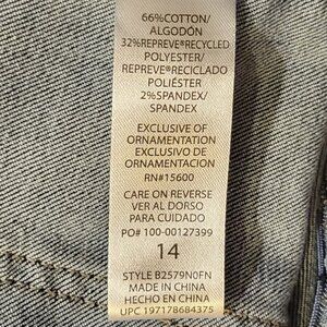 Skyrise waist, angled trouser pockets, subtle fading details, and center front seams, made from cotton and recycled polyester materials.