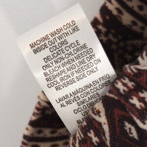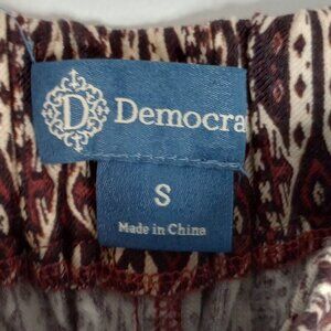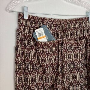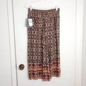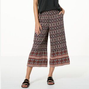 Democracy Skyrise Pull On Printed Fray Hem Cropped Pants, elastic waist pull-on style, 2 rear and 2 side pockets. Brown, white, & orange "amber spice" colors. Casual, comfy, relaxed boho style crops.