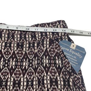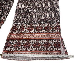 Features and details: soft lightweight material, frayed hems, slits on bottom hems, wide and flared leg, cropped length, high rise, boho print all over in blacks, browns, oranges, and cream, elastic pull-on waistband