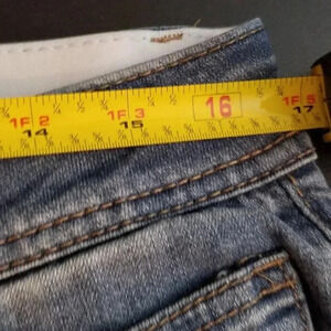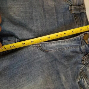 Waist 17" Rise 9.5 Inseam 28". 54% Cotton, 27% Rayon, 17% Polyester, and 2%Spandex. Good pre-owned condition.