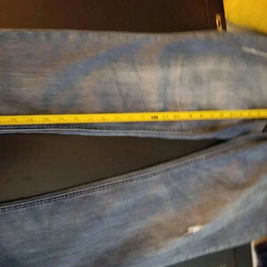 Democracy stretch straight leg jeans. Distressing on the left pocket and right thigh. Zipper and button closure with logo on button. Wide waistband. Sz 12