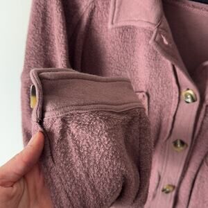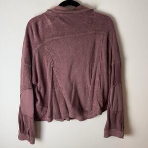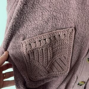 Gently Used Democracy Button Down Sweater. This is a women's medium. Dusty rose color throughout. Front pockets with intricate stitching pattern. Fuzzy appearance. Slightly cropped look to it. Soft, comfortable, and warm! 50% cotton, 50% modal.