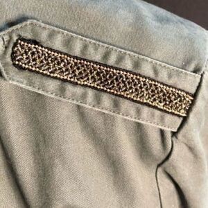 Democracy Green Boho Military Utility Jacket. Detail on shoulders and on 3/4 roll up sleeve, adjustable waist, snap closure. Size Medium. Measurements laying flat appox;