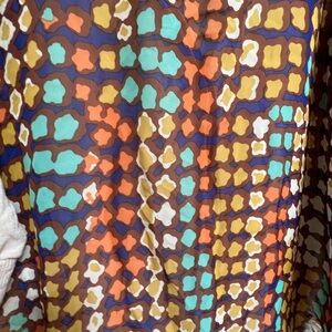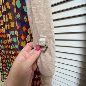 Super cute cardigan sweater!! Front is tan and the back it’s colorful and made of blouse material!! The back makes it a little dressy. Good used Condition! Smoke Free Home