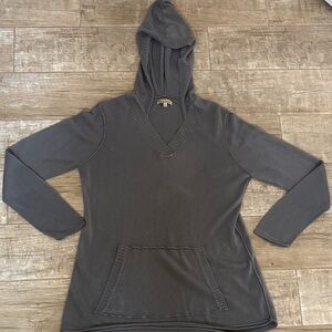 Democracy Women's Charcoal V-Neck Hooded Sweater. 100% acrylic