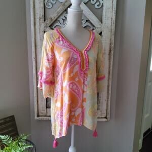 Flounce raglan short sleeve paisley printed top with tassel, crochet and fringe detail by Democracy.