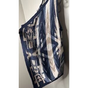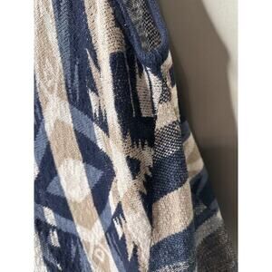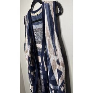 Add some colorful bohemian flair to your wardrobe with this Democracy Women's Open Cardigan Sleeveless Sweater Vest. This medium-sized vest features an open-knit style with a V-neckline and pockets, perfect for a casual occasion. The blue, tan, and cream color scheme gives it a classic and versatile look that can be paired with any outfit.
