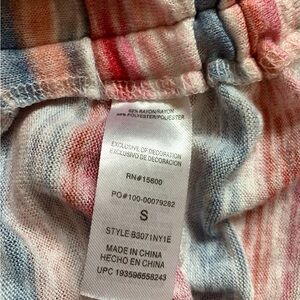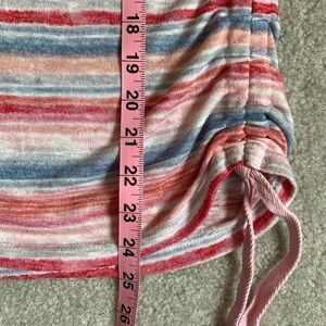 Democracy Womens Short Sleeve V-Neck Stripe Ruched Top Size Small. Side ruching with adjustable ties. Shades of pinks,blues and white. Very soft and perfect for summer.