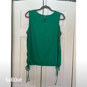 The Democracy women's blouse in size L is a sleeveless top in a vibrant green color. Made from a blend of cotton and modal, it features a decorative drawstring hem. This regular-sized blouse is suitable for casual outings or relaxed gatherings. Originating from China, it is pre-owned. Keywords: Democracy, women's blouse, green, sleeveless, cotton, modal, drawstring hem, casual wear, size L, pre-owned, China, regular size, women's clothing, summer top, sleeveless blouse.