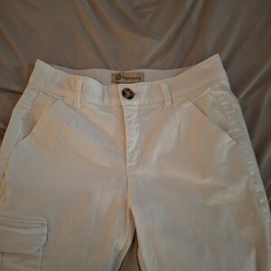 Democracy women's white denim cropped cargo jeans. Size 4 with Ab technology. waist side to side measures 14-1/2 inches. Length 34 inches. inseam 24 inches.