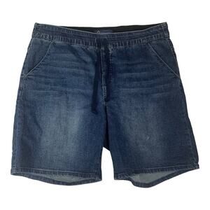 These Democracy blue jean shorts offer a relaxed fit with an elastic waistband and drawstring closure for adjustable comfort. Crafted from medium-to-dark wash denim, they feature subtle fading for a classic, worn-in look. Perfect for casual outings, these shorts provide both style and ease.