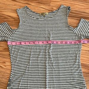 Democracy Cold Shoulder Top, 3/4 sleeves, soft, grey white stripes, medium