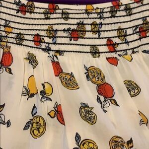 Light and float Democracy blouse with citrus fruit design. Guaranteed to brighten your day! Lovely sleeves and ruffles accent this beauty.