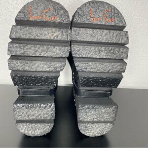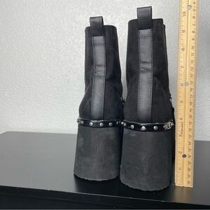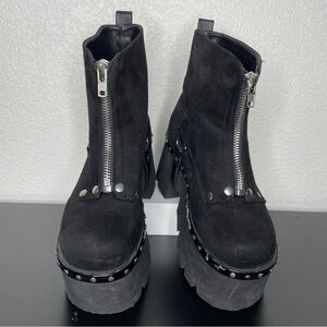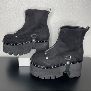Bold black ankle boots by Demonia. Features chunky platform sole. Studded strap accents. Zipper closure for easy wear.