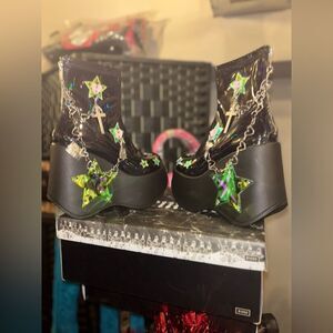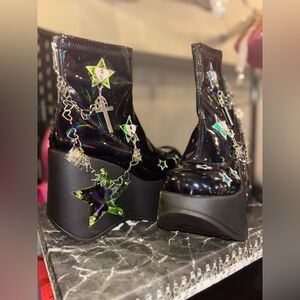 Elevate your style to new heights with these out-of-this-world platform boots from Demonia. Featuring a sleek black patent leather upper adorned with colorful LED stars, silver crosses, and heart charms, these boots are sure to make a statement. The thick, curved heel and platform sole add a touch of drama, while the LED lights add a futuristic flair. Perfect for festivals, concerts, or just adding some extra sparkle to your everyday look.