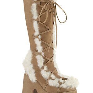 Let out your true self take over in the Primal Desire Platform Boots from Demonia. These savagely hot rave boots feature a full caramel vegan suede outer, faux fur lining, lace-up front, interior zipper closure, and 5" block heel. You were born wild and with these cute boots no one will tame you!