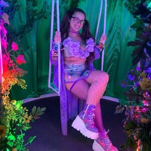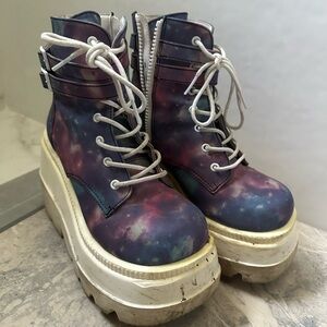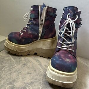Demonia X Iheartraves Super Stacked Purple Galaxy Reflective Platform Boots. Worn a few times, one scuff on the toe box (from ezoo 2023). Size 7 and fit well but would fit a 6.5-7 or true 7.