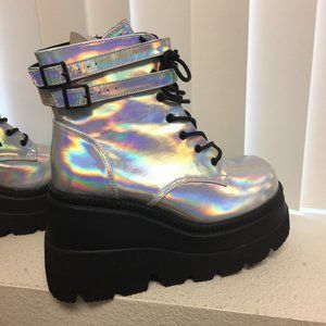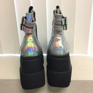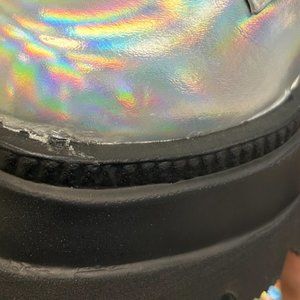 Holographic silver boots with black platform. Lace-up front with buckle detail. Reposhing because they are sadly too big on me. Almost new, has tiny scuff on the inside left.
