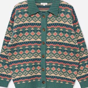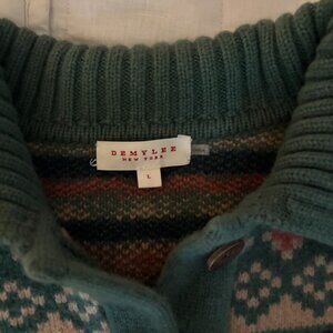 Gorgeous and thick Demylee Doriann cardigan in 100% wool. This cardigan has a beautiful fair isle motif and is of a substantial weight. Comes with slightly cropped sleeves, with ribbed cuffs, hem, and collar. The cardigan is in excellent condition and has only been worn a few times. Note: the size is a large, but I would argue that this cardigan would fit a small-small/medium at most. It is fairly fitted. Please see the measurements below.