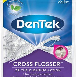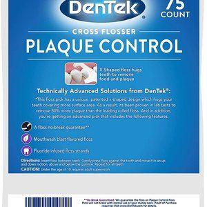 DenTek Cross Flosser Plaque Control Floss Picks feature X-Shaped floss that hugs teeth to remove food and plaque Removes 80% more plaque than the leading rolled floss* *In laboratory testing Unique 2x Cross Floss design curves around teeth to clean better Mouthwash blast flavored scrubbing floss infused with fluoride Floss no-break assurance – DenTek assures the floss on DenTek Cross Flosser Plaque Control Floss Picks will not break with normal use or your money back** **Proof of purchase required DenTek Floss Picks are the first floss pick to be accepted by the ADA Contains 1 pack of DenTek Cross Flosser Plaque Control Floss Picks, 75 count