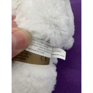 Adorable Main white bear plush, featuring plastic blue eyes, adorned with a purple pink striped ribbon bow. Ideal companion for your little one, sits 7 inches tall.