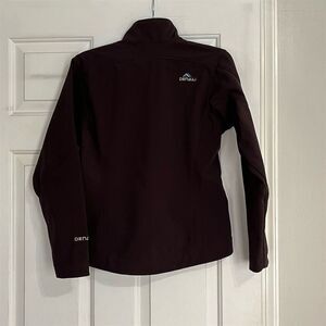 Keywords: Denali jacket, women's jacket, brown jacket, fleece lining, fall fashion, casual jacket, stretch fabric, embroidered accents, pre-owned jacket, excellent condition, machine washable, long sleeve, solid pattern, zip closure.