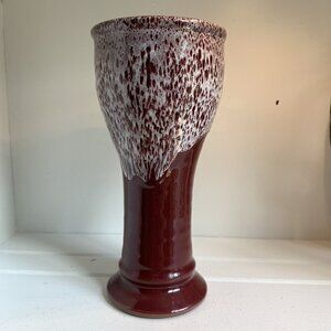 Excellent used condition. Measures 7.5" tall, 3.5" diameter at opening. Dark maroon color. Handthrown/handmade.