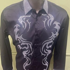 Deniko Men's Black and Silver Dress Shirt Button front rhinestone modern fit