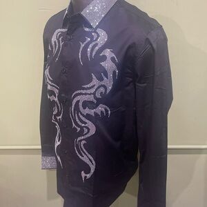 Elevate your style with this sleek black dress shirt featuring elegant silver accents. Perfect for formal occasions or a night out.