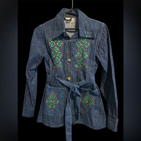 Denim 1970’s Embroidered Jacket Made in Mexico with belt Sz S