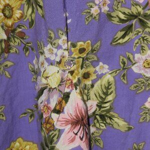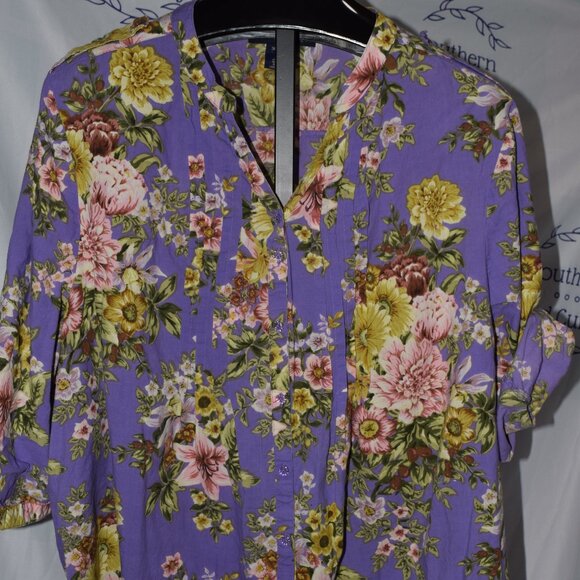 Crafted for both style and comfort, the Denim 24/7 Floral Button Front Blouse is a versatile addition to any wardrobe. This size 32W blouse features a charming floral pattern that adds a touch of elegance to casual, business, or travel attire. Its 3/4 roll tab sleeves and collared neckline provide a classic look that's easy to dress up or down. The blouse is designed with a relaxed fit to accommodate a variety of body types, and it's made from soft, machine washable 100% cotton for easy care. Whether you're in the office or out for a leisurely stroll, this tunic-style top with pleated accents and button closure is perfect for all seasons, offering both style and practicality. Colorful floral print on purple. The shoulders have accents tabs and the back has a gussett with button trim. Hemline is shirttail and breast is pleated. Measurements are bust 31, waist 33, and length 45. Blouse was measured laying flat and unstretched.
