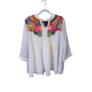 Denim 24/7 Ivory Embroidered Tunic Blouse With Sheer Sleeves Size 24W