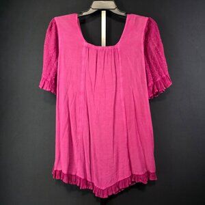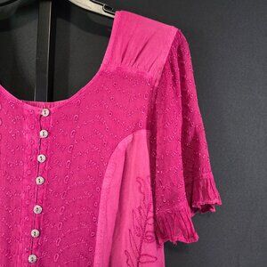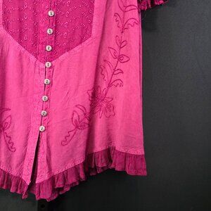 A beautiful example of bohemian style from plus-size brand Denim 24/7, this tunic is crafted from a soft, lightweight 100% rayon gauze in a vibrant fuchsia pink. The piece is rich with texture and detail, featuring an embroidered eyelet fabric on the bib and sleeves, and delicate tonal floral embroidery on the lower panels. Ornate, decorative silver-tone buttons run down the front, while a ruffled hem adds a final touch of feminine flair. This is a perfect top for capturing a free-spirited, peasant-inspired look.