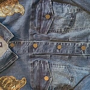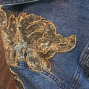 Blue jean denim jacket with gold beaded and sequins on shoulders.
