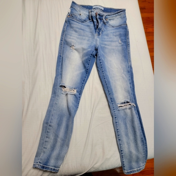 never worn Denim jeans ankle length with knee slits stretchy size 4