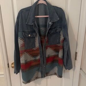 Stylish denim jacket with Aztec pattern. Features blue, red, and gray colors.