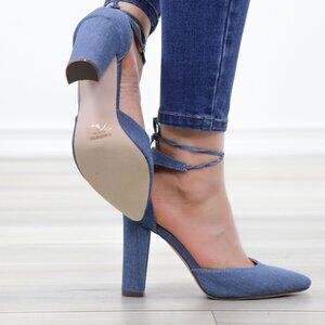 Denim Block Heel Wraparound Pumps • Style: High heel pumps with ankle tie and block heel • Color: Denim blue • Material: Denim fabric upper • Toe: Pointed toe • Closure: Wraparound ankle tie with bow • Sole: Rubber sole with light tread • Heel height: Block heel approx 4.5 in • Details: Thick heel for stability, denim texture, statement ankle wrap • Condition: New with box • Occasion: Casual chic, brunch, date night, street style • Fit reference: Shown on size 7.5 fits true to size • Shipping: Ships next business day