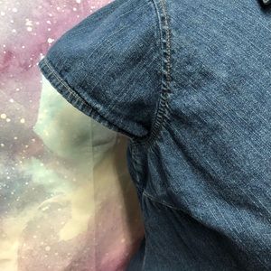 This is a cute denim blouse from 2000-2010. Has little to no stretch! Since this an older piece, I do not remember the brand.