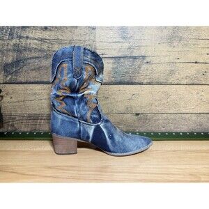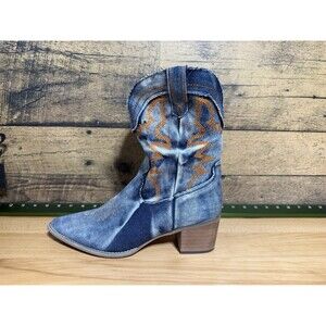 These size 11 denim blue jean cowboy boots are brand new and never worn, featuring a stylish pointed toe and a comfortable mid-calf shaft. The pull-on closure and block heel make them easy to wear, while the Western cowgirl theme adds a touch of flair. Made of denim with a mid-height heel, these boots are perfect for adding a rugged yet chic touch to any outfit.