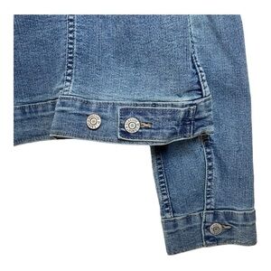 fits like a cropped jacket.Stylish denim blue jacket perfect for casual outings. Features a classic design with button closures and front pockets.