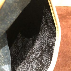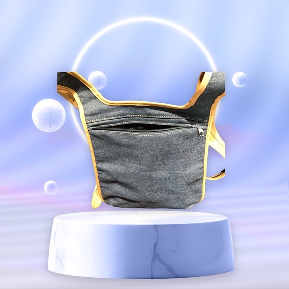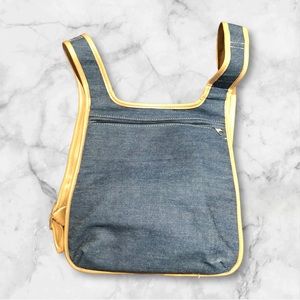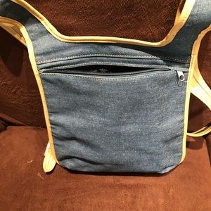 Women's Denim Blue/Tan Trimmed Lightweight Back Pack With Double Compartments. Flat Design. The front compartment is Zippered closure with one inside slash pocket. The back compartment is a large open slash pocket.