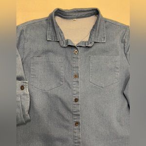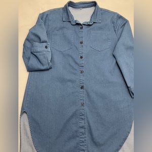 Women’s Size Medium, Denim High Low, Button Down Jean Shacket Top. In Beautiful Condition. Super Classy! Coming From A Smoke Free & Clean Home.